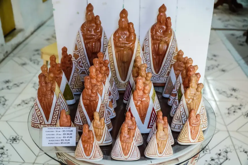 O filho do mestre, Bruno Gonçalves, também segue a tradição familiar na produção artesanal. Natural de Icoaraci, ele afirma que o espaço para comercialização no centro de Belém amplia o alcance das peças, principalmente entre turistas. “Nasci no meio do barro e fui criado na olaria. Criar a peça e ver a admiração das pessoas pelo nosso trabalho é apaixonante. Nós somos de Icoaraci e poder ter um espaço no São José Liberto, em uma área central de Belém e com presença constante de turistas, ajuda muito. De forma estratégica, disponibilizamos peças pequenas, mais fáceis de transportar, tipo souvenir”, afirma.