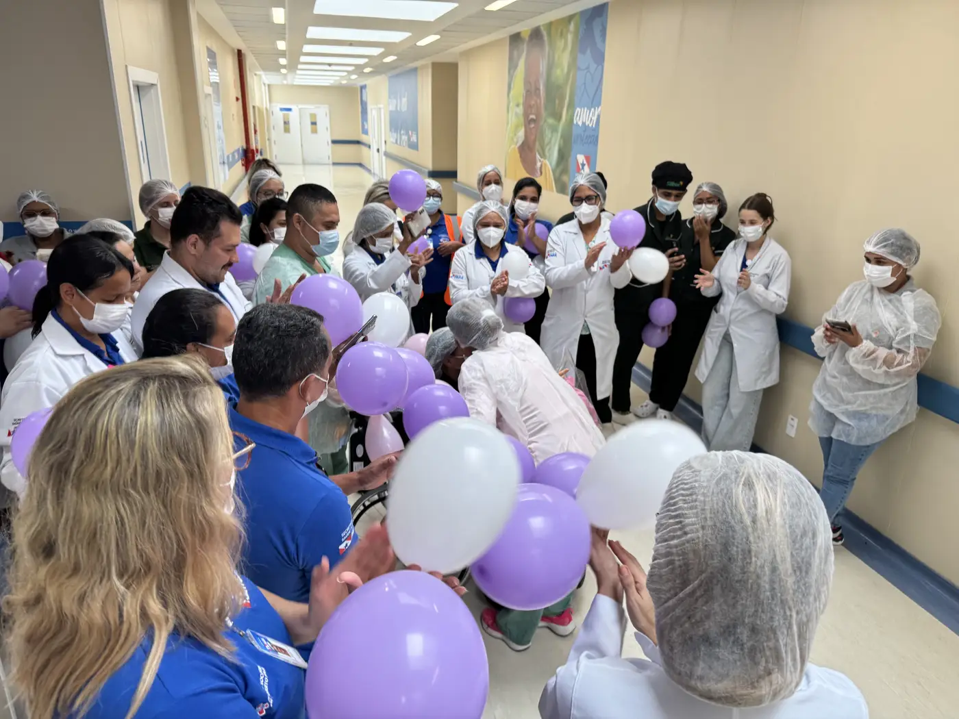 Para marcar o momento especial, profissionais do hospital formaram um corredor de despedida com balões coloridos, transformando a saída do hospital em celebração pela vida da paciente e pelo vínculo afetivo construído ao longo de jornada no PSRM.