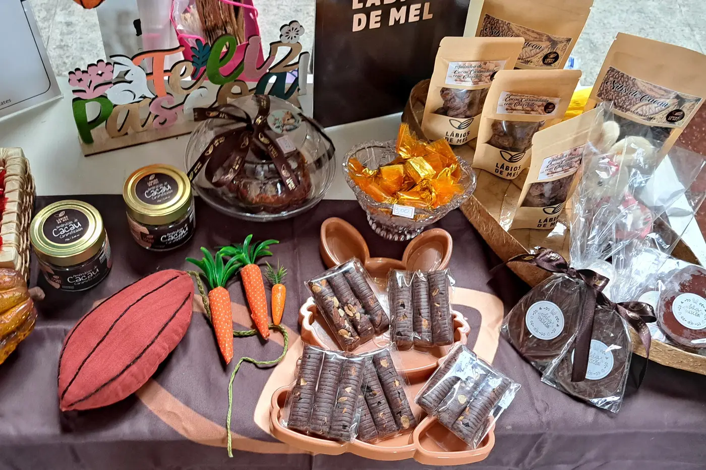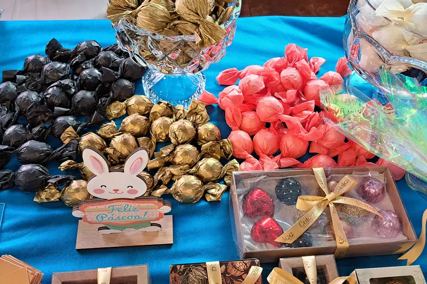 No local, é possível encontrar os tradicionais bombons recheados com frutas regionais, uma diversidade de chocolates produzidos artesanalmente e peças artesanais inspiradas na data comemorativa.