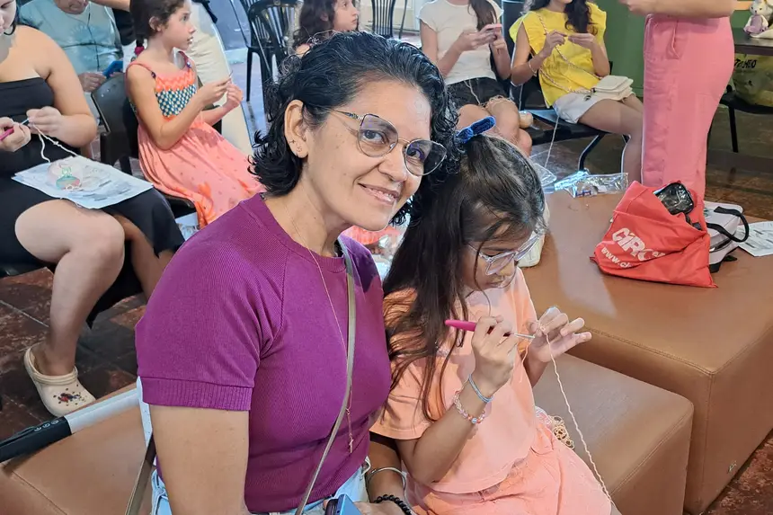 Patrícia Melo, 52 anos, levou a neta, Valentina Melo, de 9 anos, para participar da oficina de crochê. Ela conta que pratica a técnica há muitos anos e já havia ensinado a neta, embora sem a didática adequada. “Valentina sempre demonstrou interesse pelo crochê. Está sendo gratificante vê-la dando os primeiros passos nessa arte, que certamente contribuirá para o seu desenvolvimento.”