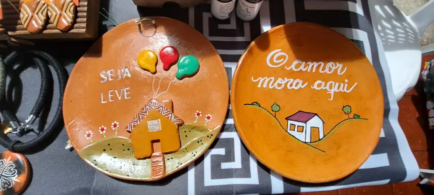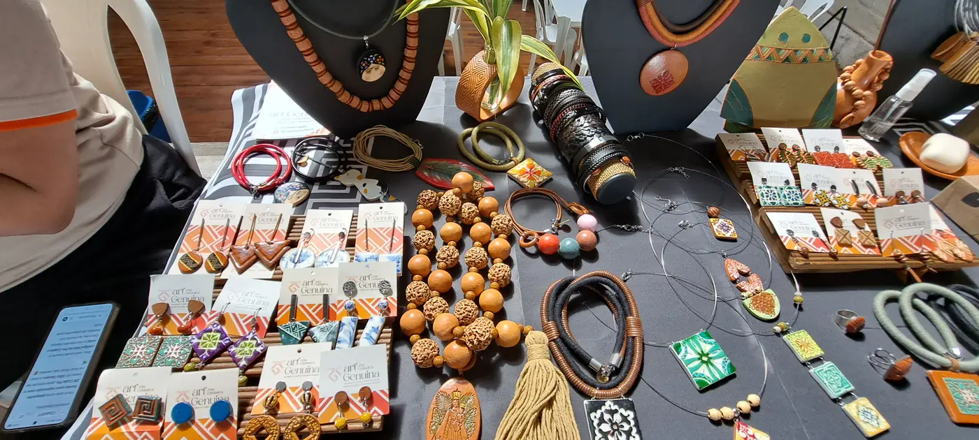 Sustentabilidade - Uma das expositoras, Valdenise Genu, é artesã, ceramista e representante do Ateliê Art’Genuína, criado em 2017. Ela se destaca na produção de biojoias e objetos sustentáveis, feitos a partir da lamugem — material que escorre das mãos dos oleiros durante a modelagem do barro.