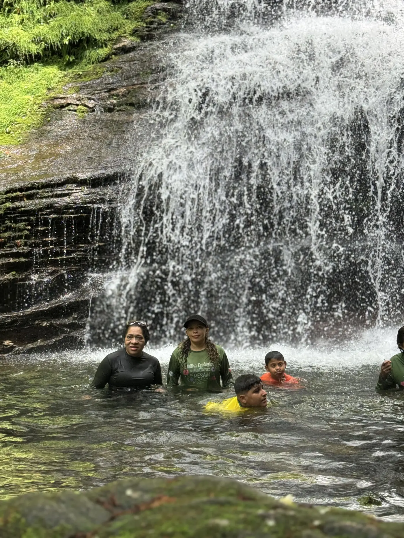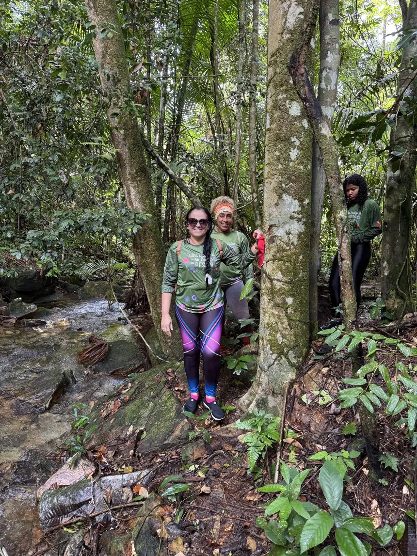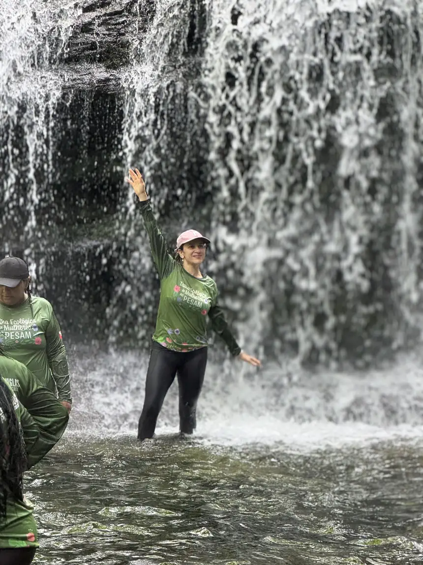 Por volta das 9h, o grupo partiu em direção ao Parque Estadual. Ao chegarem, as participantes fizeram o aquecimento, um cuidado que reflete a essência do evento: antes de cuidar de outros, é preciso cuidar de si. Com energia renovada, elas iniciaram a caminhada de aproximadamente 2,5 quilômetros pela trilha ecológica, rumo a dois dos atrativos do Pesam: a Cachoeira Vargem Grande e o Poção do Antônio Crente, cujas águas cristalinas e paisagem exuberante foram o cenário perfeito para a celebração.