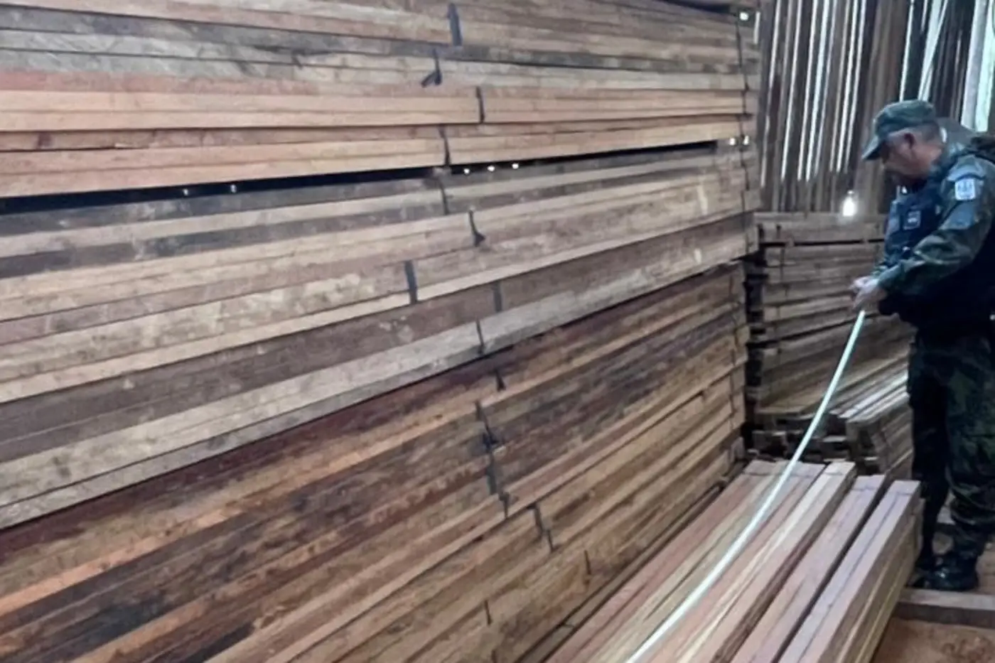 Agente do Batalhão de Polícia Ambiental (BPA) faz a medição da madeira apreendida em estabelecimento na Arthur Bernardes