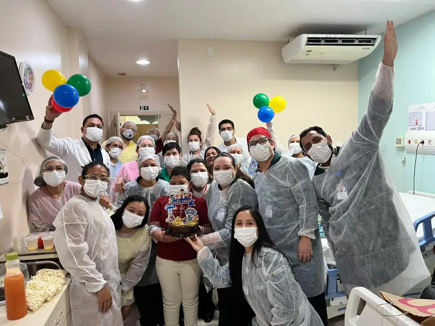 Equipes de profissionais de saúde celebram cada momento importante dos pacientes. Na foto, o aniversário de João Lucas.