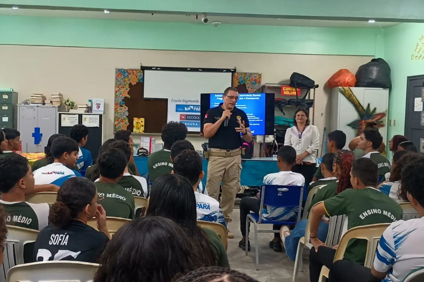 A ação foi ministrada pelo coronel Sérgio Fialho, do Núcleo de Segurança Pública e Proteção Escolar (Nuspe/Seduc), com a colaboração da psicóloga Regina Batista, da equipe psicossocial da Diretoria Regional de Ensino (DRE) Belém 9. Ambos ofereceram orientações e esclareceram dúvidas dos estudantes.