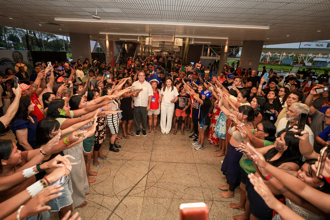 Ao longo do último dia de programação, o público acompanhou apresentações culturais de diferentes povos indígenas, com danças, cânticos e expressões tradicionais que marcaram o encerramento da semana. A governadora Hana foi recebida de forma calorosa pelas mulheres indígenas, participou de danças e cânticos e, ao final, recebeu presentes de artesanato de diferentes povos, como Tembé e Kaxuyana.