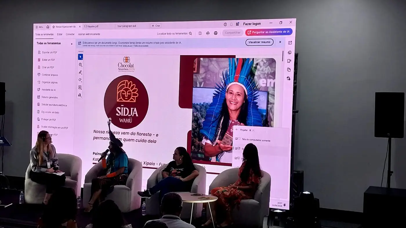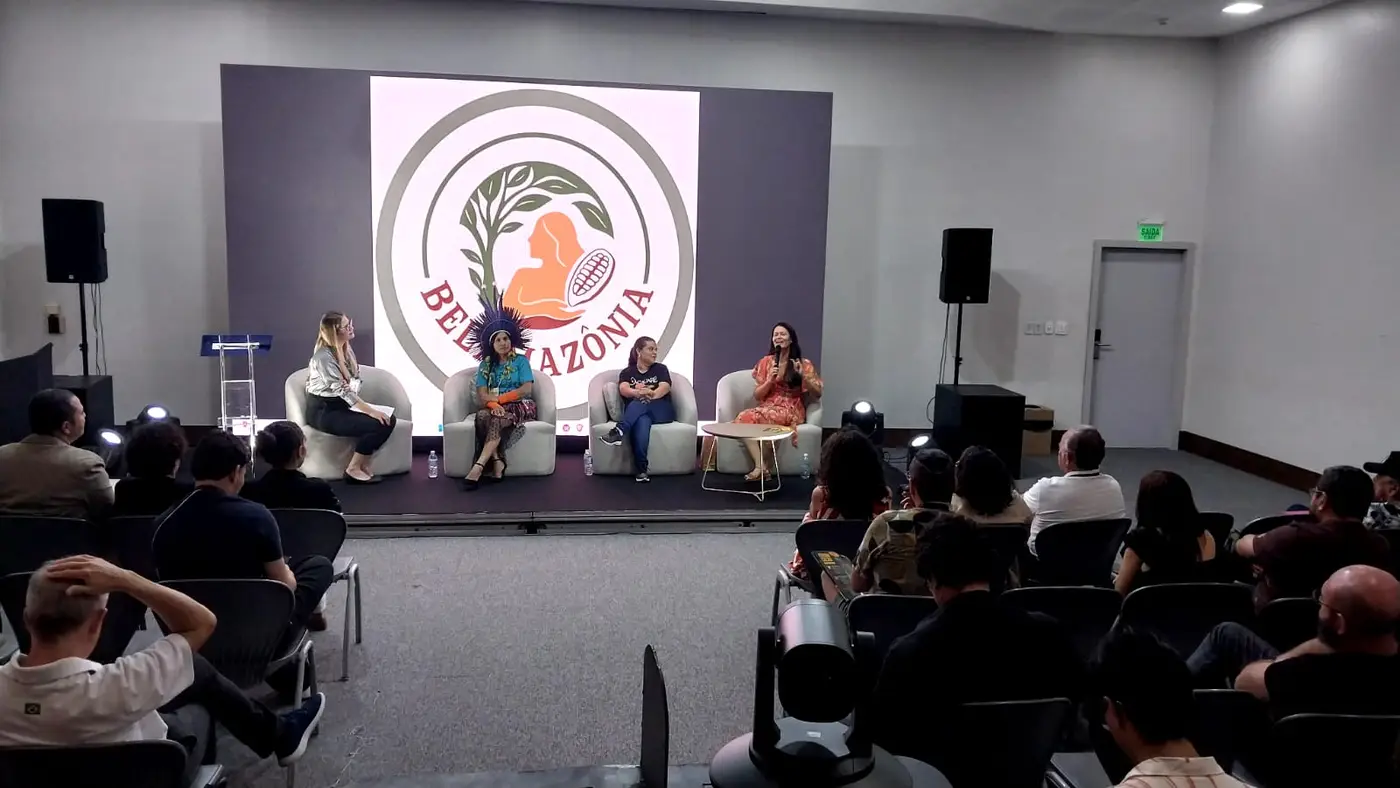 O painel reuniu a líder indígena e produtora Katiane Xypaia; a engenheira ambiental e sócia fundadora da Cacauaré (do município de Mocajuba, na Região de Integração Tocantins), Naianny Maia, e Tatiana Galvão, pedagoga e produtora de cacau e de chocolate do empreendimento Bela Amazônia, na Região de Integração Xingu.