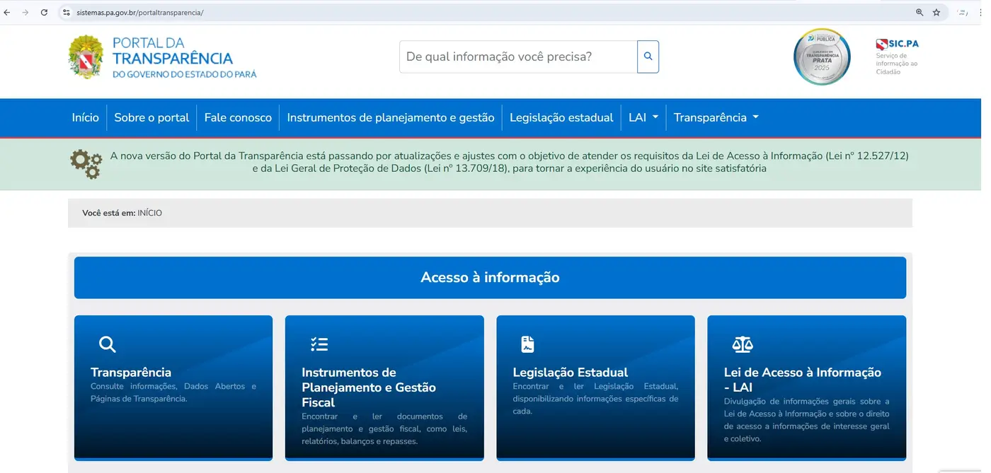 Portal Transparência do Executivo Estadual conquista 'Selo Prata de Transparência Pública'